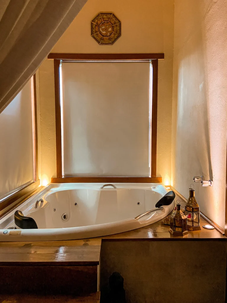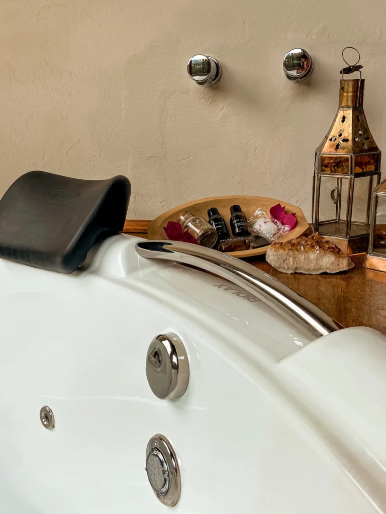 Ao entrar neste espaço, você será recebido pela banheira de hidromassagem com cromoterapia, sais e espuma de banho exclusivas, um convite perfeito para relaxar com cores suaves, criando uma atmosfera de de autocuidado e tranquilidade.