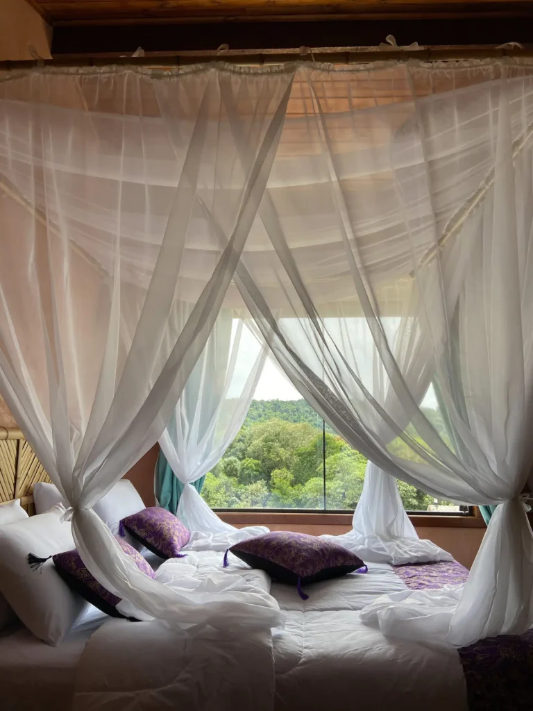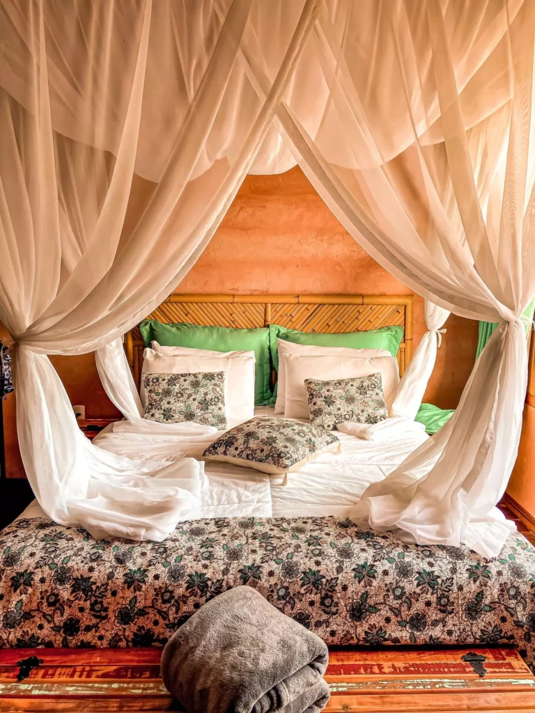 Aqui, uma cama queen size, decorada com um dosel, cria um ambiente aconchegante e romântico, perfeito para casais em busca de momentos especiais.